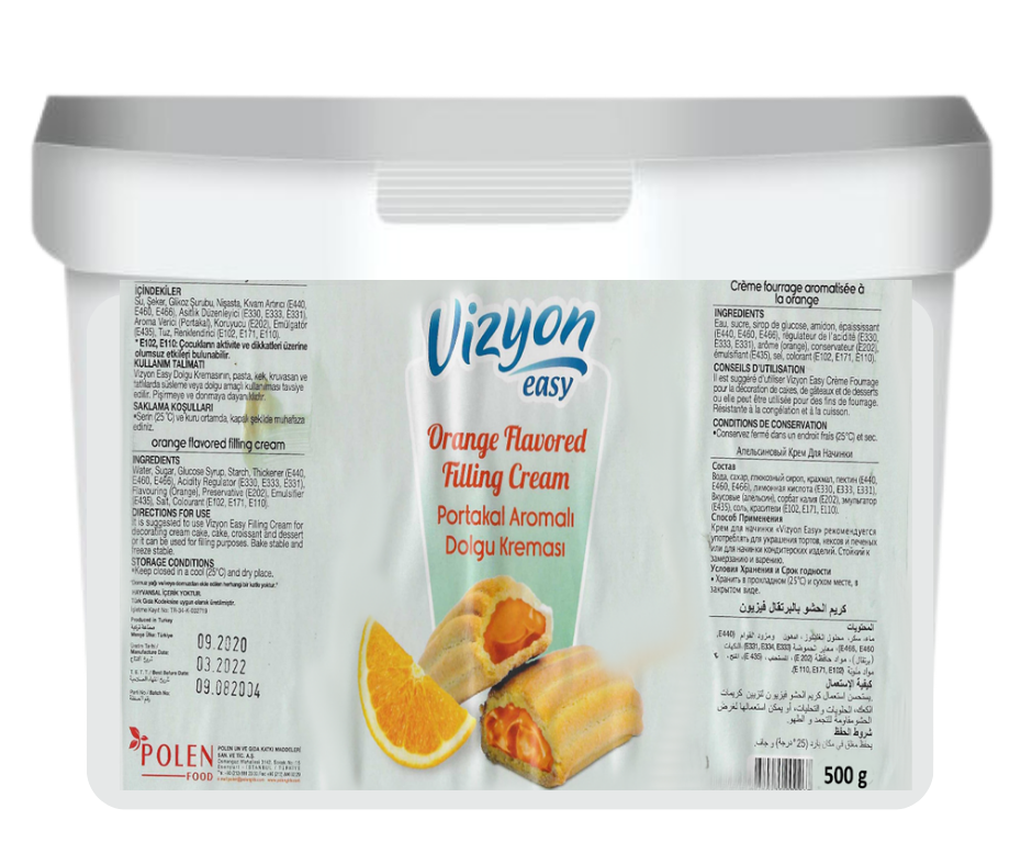 حشوة البرتقال من فيزيون vizyon orange filling cream الكريمية الجاهزة بقوامها المثالي و الناعم بنكهة منعشة واصليه لتعطي طعم رائع ومميز لحلوياتك , محضره من الفاكهة الطبيعية لا تحتوي على نكهات و الوان صناعية خالية من الغلوتين متعددة الاستخدام يمكن ان تستخدم كحشوة لكافة انواع الحلويات المخبوزة مثل الكيك , الكوكيز , المافن , الدوناتس, اكلير, التارت … بالاضافة لاستخدامها للحلويات الباردة و ايضا حشوات مميزة لصناعة الشوكولاته